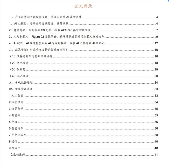 近期国内外 AI 迎来新进展,终端应用百花齐放。马斯克旗下 Grok-2 新增图像生成,性能比肩 GPT-4o;华为享界 S9 亮相,搭载 ADS 3.0 高阶智能驾驶;Figure AI 第二代人形机器人 Figure 02 震撼问世,被誉为“地球上最先进的 AI 硬件”;Ray-Ban Meta 销量冲高,Llama 3 打造多模态交互新载体。政策方面,当前财政资金重点支持的领域建议重点关注设备更新以旧换新、电网投资以及创新药,这三大方向。此外,地产链也有望成为重点支持的潜在领域,应重点关注支持资金落地速度。中观数据方面,全球 AI 网站访问量涨少跌多,手机端 APP 国内下载量(不包括国内安卓)排名前四为豆包、文心一言、Kimi 和星野;7 月国产新能源销量整体下降, AITO 问界、零跑、理想同比大涨;光伏新增装机量同比增速下降,风电新增装机同比增速上升,电网和电源建设稳步开展。