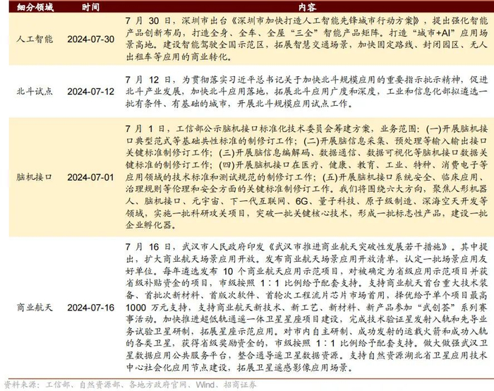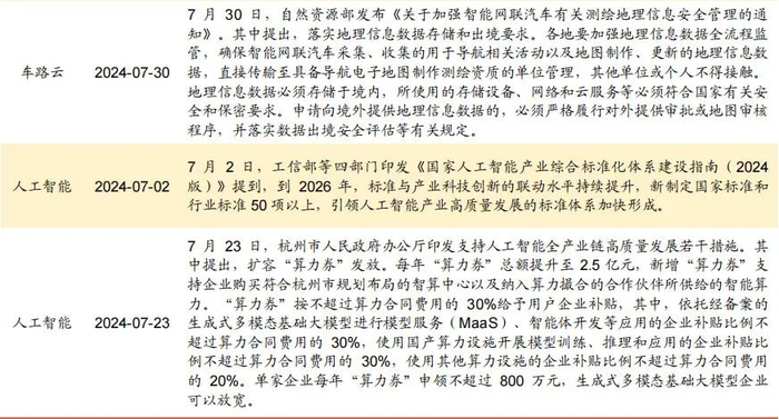 产业政策端,七月新质生产力相关支持政策频出。具体来看:1)低空经济方面,上海、广州、郑州印发支持文件;2)车路云方面,工信部发布智能网联汽车“车路云一体化”应用试点城市名单,自然资源部发布《关于加强智能网联汽车有关测绘地理信息安全管理的通知》,北京、广州等地发布支持文件;3)人工智能方面,工信部等四部门印发《国家人工智能产业综合标准化体系建设指南(2024 版)》,杭州、深圳印发支持方案。
