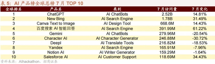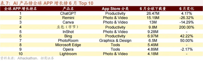 7 月全球 AI 产品(包含 Web 跟 APP)榜排名前十中,ChatGPT、New Bing、Canva Text to Image、百度搜索 AI智能回答、Salesforce AI 访问量上涨,其余 AI 产品访问量下跌。其中百度搜索 AI 智能回答涨幅最高,高达61.22%;Character AI 跌幅最高,达 30.72%。国内 AI 产品榜排名前十家访问量有 7 家上涨。从手机端 AI 应用看,6 月全球下载量(不包括国内安卓)排名前四为 ChatGPT、Remini、Canva 和豆包,国内下载量(不包括国内安卓)排名前四为豆包、文心一言、Kimi 和星野。
