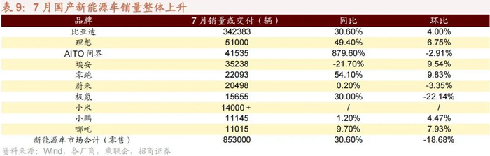 7 月国产新能源销量整体下降,销量为 85.3 万量,环比下降 18.68%,AITO 问界、零跑、理想同比大涨。第一梯队来讲,比亚迪、理想、AITO 问界 7 月销售量分别为 34.24 万辆、5.10 万辆、4.25 万辆,比亚迪、理想分别环比上升 4.00%、6.75%,AITO 问界环比下降 2.91%。第二梯队车企及大部分新势力车企 7 月表现比较稳定。零跑、蔚来、极氪分别同比上涨 54.10%、0.20%、30.00%。埃安、小鹏、哪吒 7 月销量环比上升分别为 9.54%、4.47%、7.93%