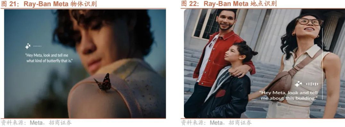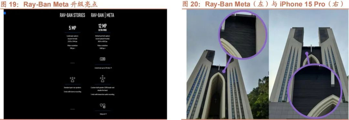 Ray-Ban Meta 相较于上一代的 Ray-Ban Stories 有了明显进步。首先, Ray-Ban Meta 将其摄像头由 5MP 升级为 12MP 超广角镜头的摄像头,拍摄图像质量和清晰度有了很大的提升,可满足日常大部分场景的需求,也可支持最高 60 秒的 1080P/60fps 规格的视频录制;其次, Ray-Ban Meta 拥有了全新定制设计的扬声器,低音提升 2倍,最大音量提高 50%,以改进上一代的声音失真缺陷, “定向音频”技术的加入,也优化了漏音问题;此外,Ray-Ban Meta 还搭载了“五麦克风阵列”,支持沉浸式音频录制,用眼镜录制视频切片时,设备能准确地捕捉到最接近当下环境的声音,多声道还原来自身周的真实音效。眼镜本体满电下的续航时间为 4 小时,眼镜盒可以为眼镜充满 8 次电,相加之后的总续航时间可以达到 36 小时,支持快充,22 分钟即可充到 50%。