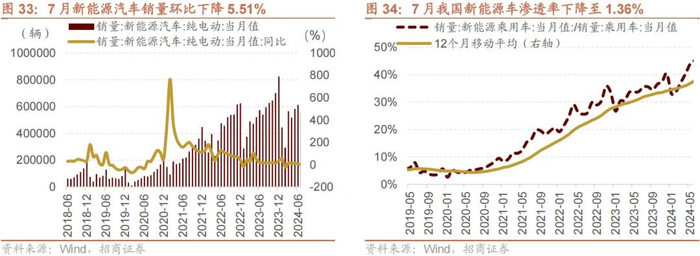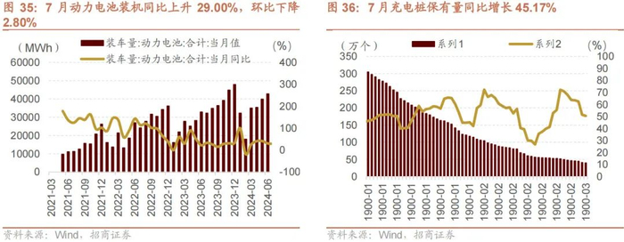 7 月新能源车销量同比上升,动力电池装机同比上升,充电桩保有量稳步上行。Wind 数据显示,7 月新能源车销量 99.1 万辆,环比下降 5.51%,同比上升为 27.02%,渗透率下降至 1.36%;7 月动力电池装机 41600 兆瓦时,同比上升 29.00%,环比下降 2.80%;7 月充电桩保有量 320.94 万个,同比增长 45.17%。