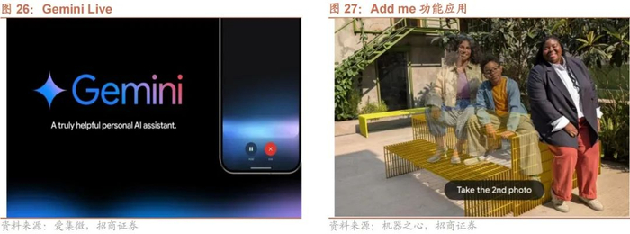 数据处理能力上更为强大,能支持长时间对话。此外,Google 将 Pixel 9 系列的相机誉为“世界上第一款 AI 相机”,这突显了 Google 对其 AI 技术的自信。在 Pixel 8 中推出的“Best Take”功能能够 AI 选择多张照片中每个人的最佳部分并自动合成一张照片;Pixel 9 进一步增加了“Add me”功能,允许用户无需外部帮助即可将自己添加到合照中。此外,升级的 Magic Editor 除了前代的改变画面曝光、去除背景与移动画面元素的功能外,只需要现在能够根据用户输入的文本创造图片,这将手机摄影推向了现实与虚构的交界。