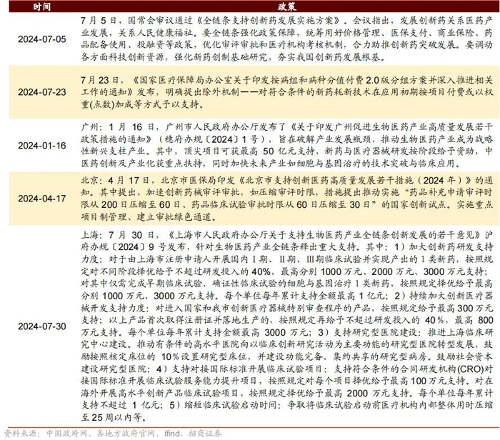 今年以来,创新药支持政策频发。从 3 月政府工作报告提及创新药,到 7 月国常会审议通过《全链条支持创新药发展实施方案》,创新药支持政策不断出台,地方层面,北京、上海、广州等地均发布了相关支持政策,创新药政策暖风频吹。此外,生物医药领域的新基金也在不断设立。据不完全统计,深圳、北京、安徽等地均新设立了生物医药领域基金,重点投向创新药领域: