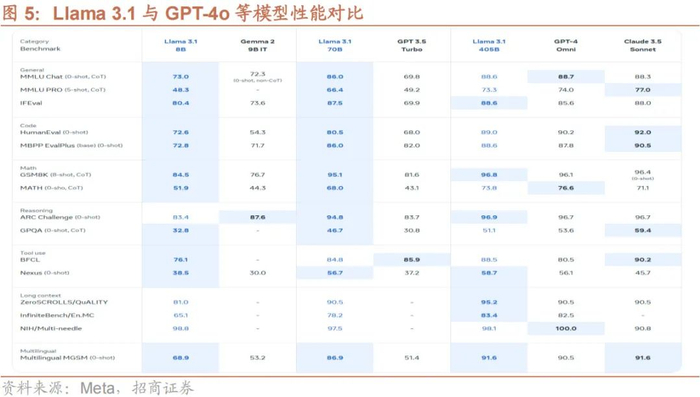 在这些适应性调整下,Llama3.1 405B 拥有了更加强大的性能。Meta 对 Llama 3.1 进行了全面的评估,包括超过150 个基准数据集的测试,涵盖多种语言和任务类型。具体来看,Llama 3.1 405B 在 IFEval、GSM8K、ARCChallenge 和 Nexus 等多项测试中均优于 GPT-4o。在多项 MMLU 测试和 GPQA 测试等方面 Llama 3.1 405B 则稍显逊色。不过总体而言,Llama 3.1 405B 与 GPT-4oClaude 3.5 Sonnet 等模型相比各有胜负,不相上下。在小型模型性能对比中,Llama 3.1 的 8B 和 70B 模型均表现出色,与同等规模的闭源和开源模型相比具有很强的竞争力,在几乎所有测试中都打败了对手,性能强劲。