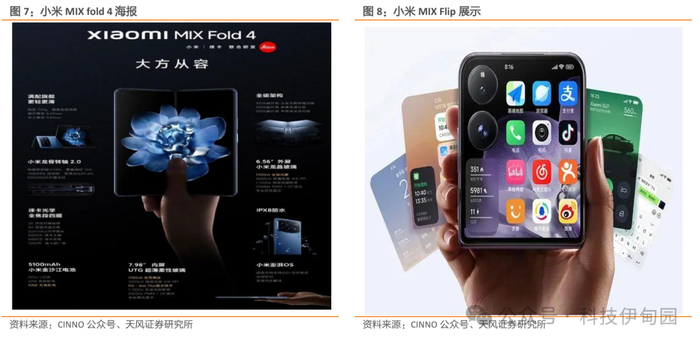 7月19日,小米发布MIX Flip/MIX Fold 4折叠屏手机。外观设计方面,小米 MIX fold 4 重 226 克,单边厚度 4.59mm,折叠后厚度仅 9.47mm,采用金属中框、四微曲机身设计。小米还为它引入了重金打造的「全碳架构」,号称 100% 碳纤维转轴浮板、100% 碳纤维屏幕衬板、100% 碳纤维中框电池仓衬板;采用 T800H 高强度碳纤维,抗冲击强度提升 300%。此外,该机搭载了小米龙骨转轴 2.0,拥有 12 个齿结构,采用超微水滴形态 3 级连杆结构,体积整体缩小 34%,重量降低 16%;1800MPa 超强钢占比达到 82.6%,转轴折叠寿命超过 50 万次。小米 MIX Flip 展开厚 7.6/7.9mm、折叠厚 15.99/16.19mm,重 192g,小米 MIX Flip 外屏尺寸 4.01 英寸,分辨率 1.5K、刷新率 120Hz、C8+ 屏幕材料,支持 1600 尼特全局亮度,采用等深四曲设计,配备小米龙晶玻璃。该机配备 6.86 英寸内屏,也是 1.5K 分辨率、1600 尼特全局亮度、C8+ 屏幕材料,支持 1-120Hz 自适应刷新率,以及 2160Hz PWM + DC 调光。