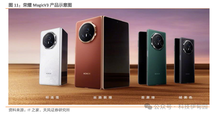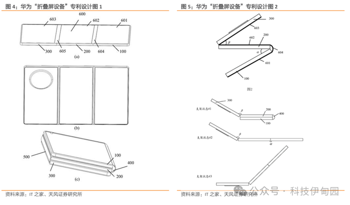 全球首个三折叠屏手机样机或将由华为出,其将搭载麒麟9系平台,融入包括华为最新AI技术在内的多项新技术。目前进展顺利,量产排期约在今年第三、第四季度。华为今年 3 月公布了一款“折叠屏设备”专利,专利提供了一种折叠屏设备,包括第一壳体、第二壳体、第三壳体、第一铰链、第二铰链和柔性屏,其中多个壳体可以不等厚,降低了设备在折叠状态下的厚度,也使其重量更轻,从而可以给用户提供更好的握持手感。