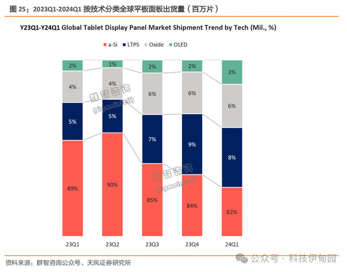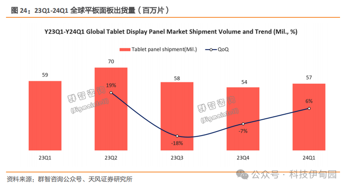 2024年一季度平板面板出货量回暖。平板面板出货量过去四个季度经历了显著的起伏:出货量在2023年二季度约7000万片,随后在第三季度和第四季度分别下滑约18%和7%;2024年第一季度,平板面板出货量回升至约5700万,市场在经历连续两个季度的下滑后,开始出现回暖迹象。2024年第一季度,面板出货量呈现增长势头,主要得益于国内平板品牌需求的攀升。国内厂商对平板产品加大布局力度,相较于2023年同期,平板面板的采购需求大幅增长18%。相比之下,海外品牌及华南渠道市场则显现出不同态势,需求出现了7%的同比下滑。2024年第一、二季度,国内平板品牌如华为、联想、小米、荣耀等纷纷加大对平板产品线的投入与布局,相继推出了各自的平板新品,带动一季度面板备货需求增加。