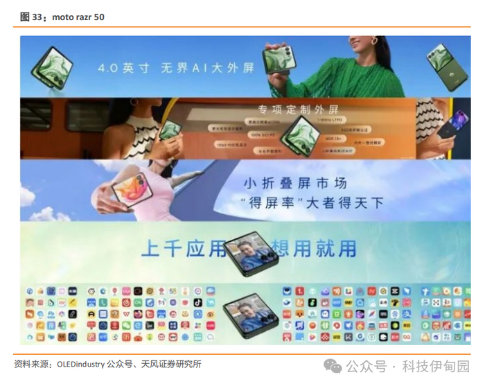 TCL华星、天马供屏,moto razr 50 /50 Ultra折叠屏手机发布,搭载4英寸超大尺寸无界AI大外屏和6.9英寸OLED内屏。售价3699元起。moto razr 50 Ultra搭载骁龙8s Gen 3移动处理平台,内屏为6.9英寸2640×1080华星光电/天马OLED内屏,支持165Hz刷新率(1-165Hz LTPO),外屏为4英寸OLED屏幕,417PPI,1-165Hz LTPO高刷,支持10bit色深、HDR 10+。内置4000mAh星海电池,支持45W有线快充,15W无线快充;