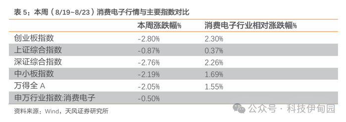本周(8/19~8/23)消费电子行情跑赢主要指数。本周(8/19~8/23)上证综合指数下跌0.87%,同期创业板指数下跌2.80%,深证综指下跌2.76%,中小板指数下跌2.19%,申万消费电子行业指数下跌0.50%。
