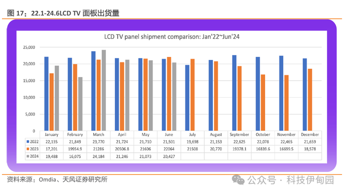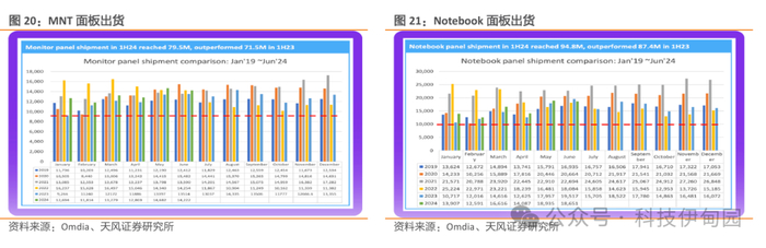 出货方面,2024上半年显示器面板出货7950万片,笔电面板出货达9480万片。显示器面板出货达到7,950万片,远高于2023年上半年的7,113万片。2024年上半年,笔记本电脑面板出货达到9,480万片,也远高于2023年上半年的8,745万片,成长明显。出货面积上,显示器面板今年上半年出货面积达到1,392万平米,2023年上半年则仅为1,231万平米,年同比大幅成长13%;笔记本电脑面板2024年上半年出货面积达到568万平米,而2023年上半年出货面积则仅为521万平米,年同比成长9%。而若IT面板需求维持2023年上下半年分布态势,大概率2024年全年显示器面板出货有望接近1.6亿片,而笔记本电脑面板全年出货则有望超过2亿片,下半年IT面板需求有望出现较去年下半年更好的态势。IT设备换机需求,AI PC带来的新增需求,都可能是当前IT面板需求维持相对强势的重要原因。