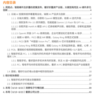 观点:1)云端大模型方面,微软、谷歌、OpenAI等头部企业持续进行模型的研发,且研发方向逐步转向商业化应用。如谷歌开放 HeAR AI 模型 API,通过1亿条咳嗽声训练,辅助筛查、诊断和监测肺结核,可用于医疗行业,OpenAl开放 GPT-4o 微调功能,企业可更轻松打造专属 AI 助手,触达ToB端应用。2)端侧AI硬件方面,三星智能戒指、字节旗下PICO MR眼镜的推出,反映了在AI赋能下消费电子产品的创新与多元化。PICO发布MR混合现实一体机PICO 4 Ultra,搭载的AI芯片性能增加800%,内置生成式 AI 虚拟场景,全面覆盖影音娱乐、办公、生产力等多种场景。Galaxy Ring本周正式发售,搭配Galaxy AI支持监测体温、睡眠、心率,通过小型的端侧设备即可检测人们的健康情况。