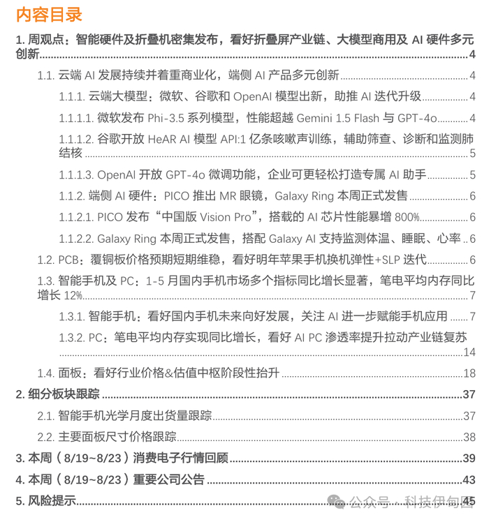 1. 周观点:智能硬件及折叠机密集发布,看好折叠屏产业链、大模型商用及 AI 硬件多元创新