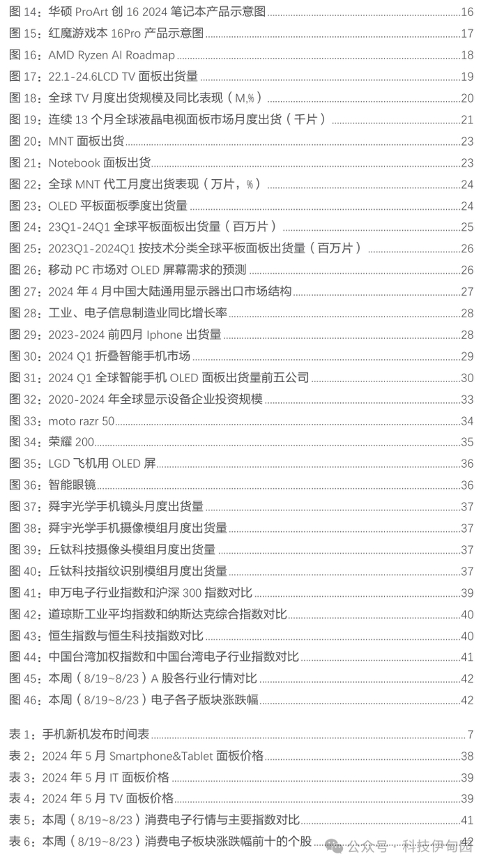 面板:1)大尺寸:夏普关闭日本唯一LCD面板厂,大陆面板控产能力进一步增强。夏普公司8 月 21 日发布公告,宣布旗下“堺显示器产品公司(SDP、堺市)” 即10代LCD面板厂已全面停产。三大面板厂京东方、TCL华星、惠科国庆可能休假14天,预期对三季度量价会有修复,长期来看头部控产格局稳定。2)中尺寸:和辉光电已量产出货国内首款27英寸4K AMOLED桌面显示器面板,拓宽了AMOLED显示屏的应用场景。在桌面显示器领域,和辉光电表示目前已成功研发出国内首款27英寸4K AMOLED桌面显示器面板,目前该产品已向客户量产出货。3)小尺寸:LTPO OLED功耗更低,我们认为或将成为生成式AI浪潮下智能手机的首选屏显方案。与LTPS OLED相比,LTPO OLED的漏电流更低,可以在低于30Hz的刷新率下低功耗运行。Omdia预计,到2031年LTPO OLED显示面板需求将达到5.2亿片,复合年增长率预计约为8.0%,其在智能手机OLED面板出货量中的市场占有率有望达到52.0%,超过低温多晶硅(LTPS)OLED。4)上游方面:中国大陆在全球显示器玻璃基板市场的份额已增至73%,主导地位不断增强。2024年第二季度中国大陆在全球显示器玻璃基板需求中的份额已增至73%,这被解读为夏普位于日本堺市的第10代液晶工厂关闭的结果。5)厂商业绩:LG Display积极重组业务结构,亏损收窄71.6%。今年上半年销售额为11.9612万亿韩元,同比增长30.7%,营业亏损也从上年的1.9798万亿韩元降至5631亿韩元,亏损收窄71.6%。LG Display正在积极重组其业务结构,计划进一步扩大OLED等高附加值产品的比例,上半年OLED占公司总销售额的50%,同比提高7%。