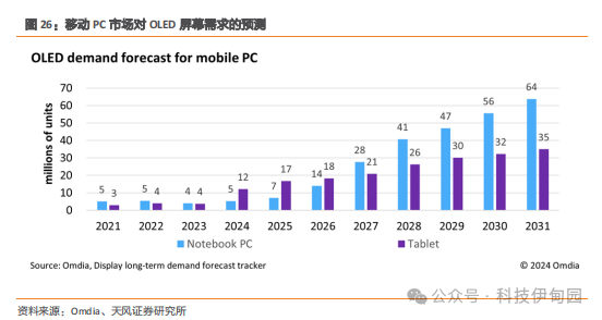 Omdia预测:2023-2031年间,移动PC市场的OLED显示屏年均复合年增长率将达到37%。受新冠疫情和通货膨胀的影响,2022年和2023年笔记本和平板电脑对OLED的需求增长出现了放缓。然而,随着支持人工智能的个人电脑的出现和人工智能性能的进步,PC厂商正在准备自2024年开始陆续推出相关新产品。此外,预计2025年下半年停止对Windows 10的支持将刺激笔记本和平板电脑市场需求的复苏。据Omdia的《显示面板长期需求预测跟踪报告》,预计2023年到2031年期间,移动PC市场对OLED显示屏的需求将以37%的年复合增长率(CAGR)增长。这一激增显示了越来越多的品牌选择在其高端笔记本电脑和平板电脑上采用OLED面板的趋势。