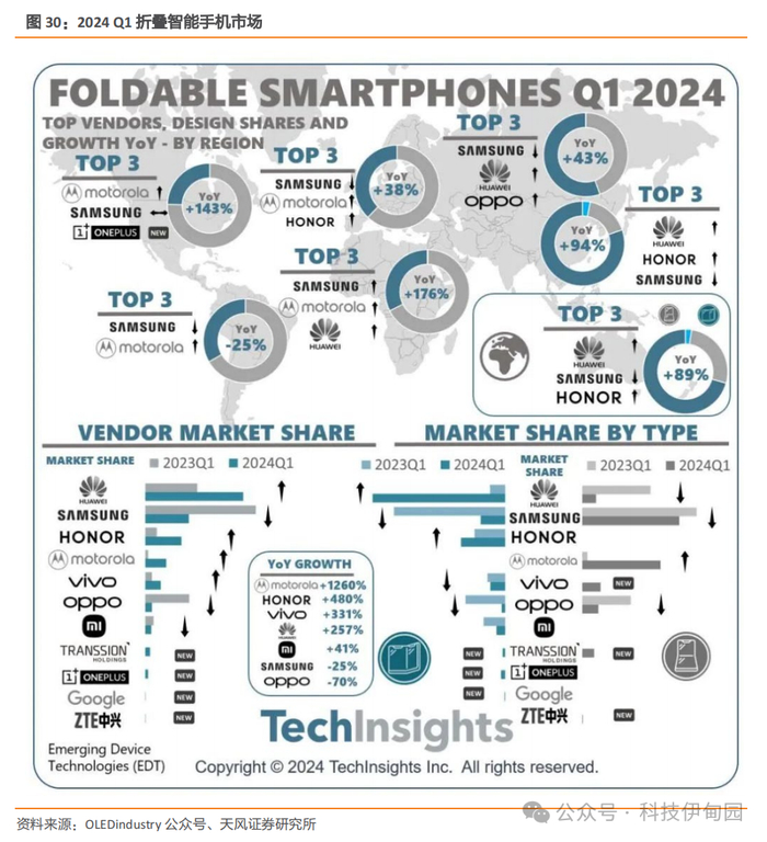 2024年Q1全球折叠屏手机市场排名:华为超越三星成为第一。5月22日消息,市场研究机构Techinsights今日发布报告称,2024年第一季度华为登顶全球折叠屏手机市场,同比增长257%,三星、荣耀紧随其后。三星在该季度表现有些低迷,但其翻盖式折叠屏手机仍占据市场领先地位。书本式折叠屏占据折叠屏手机类别的大部分份额;由于中国消费者更青睐书本式折叠屏手机,该类别同比增长最为强劲。据悉,中国市场整体折叠屏手机市场同比增长94%,其中大部分为横向书本式折叠屏手机;北美市场同比增长143%,其中部分为竖向翻盖式折叠屏手机,摩托罗拉份额超越三星,一加占据第三名。