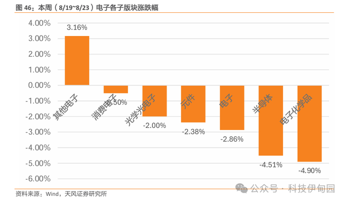 电子板块细分行业主要呈下跌趋势。其他电子/消费电子/光学光电子/元件/电子/半导体/电子化学品本周涨跌幅分别为3.16%/-0.50%/-2.00%/-2.38%/-2.86%/-4.51%/-4.90%。