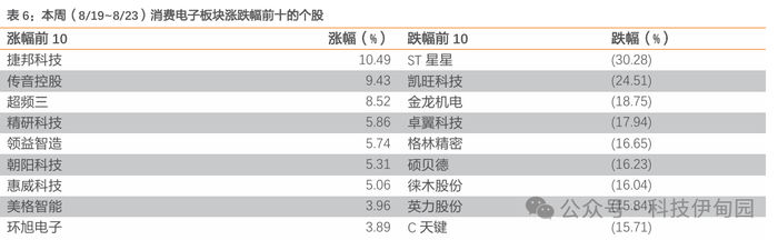 本周(8/19~8/23)消费电子板块跌幅前10的个股为:ST星星/凯旺科技/金龙机电/卓翼科技/格林精密/硕贝德/徕木股份/英力股份/ C天键/奥海科技;