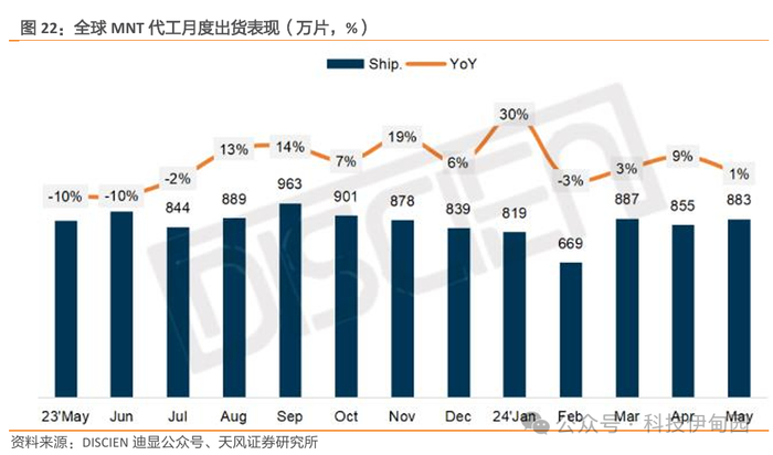 MNT出货量因采购需求前移以及航运运力紧张等多重因素影响,整体维持较低增长。5月全球中尺寸代工出货因采购需求前移和航运运力紧张共同影响,整体维持较低1%增长。红海冲突长期持续,使得出海航运周期变长,加之部分地区将上调关税,厂商和渠道提前集中出货,运力进一步紧张,同时今年面板价格上涨,品牌采购节奏前移,多方面因素间接影响代工厂出货节奏。据DISCIEN(迪显)《全球MNT代工出货月度数据报告》统计,5月代工出货883万台,同比增长1%。其中TPV(冠捷):5月出货343万台,同比增长6%,仍旧稳居第一。TPV得益于客户结构比较丰富,北美和亚太商用需求复苏,头部商用品牌采购量增加,弥补了国内市场的出货缺口,在去年较高基数背景下仍保持同比增长趋势。Qisda(佳世达):5月出货136万台,同比增长1%,排名第二。客户结构相对简单,Dell/HP二者订单量占比超7成,其余有两成台系品牌客户。同样在北美商用需求复苏下,其出货维持小幅增长。BOE VT(视讯):5月出货85万台,同比减少6%,位列第三。客户结构中小米及国内客户占比逐渐上升,已超6成。虽然Samsung订单的减少致使高创出货同比有所下滑,但预计在后续国内信创订单支撑下规模将有所回升。