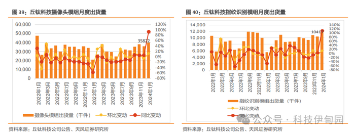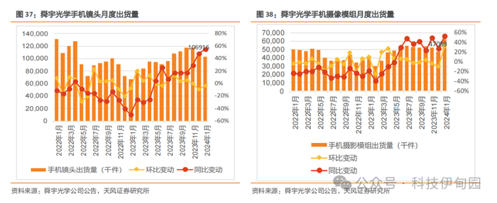 智能手机光学模组旺季出货量基本恢复至21年水平,行业有望逐步回暖。2021年OPPO、Vivo等安卓厂商备货激进,舜宇手机摄像头模组单月出货量高增长,2021/02单月出货量创新高,2021 Q2增速放缓,受安卓手机整体需求疲软及高端化不足光学降规降配影响,2021Q3/Q4开始承压,2022需求不振&下游去库存出货量持续下行,2023/02同比增速触底,2023/06同比增速转正,7/8/9连续三个月同比增速超过35%,行业呈回暖态势。2021年12月丘钛单月摄像头模组创历史新高,高端(32M以上)摄像头模组出货量持续高增长,2021/11创单月出货量历史新高,同比增速高达75%,22年受安卓需求疲软、行业去库存、手机光学降规降配影响,出货量呈整体下滑趋势,高端出货量承压更为明显,2023高端需求逐步复苏,2023/02同比增速恢复增长,7/8/9月度出货量基本回归2021年水平。2024年势头较好,2024/01出货量较大且同比和环比变动幅度大。