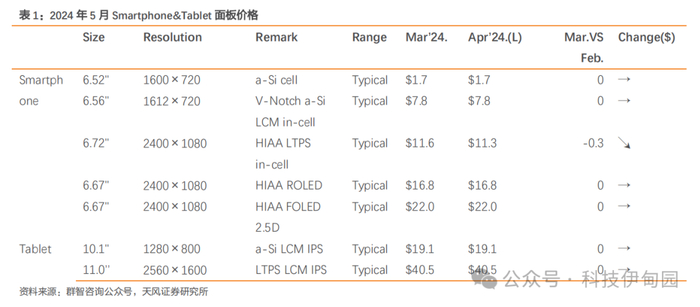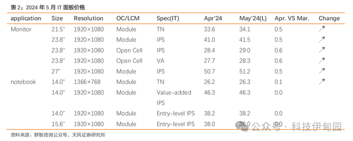 IT面板价格:Monitor面板方面,根据群智咨询数据,预计5月OC面板价格涨幅小幅缩窄,LCM面板价格涨幅与上月持平。根据群智咨询数据,21.5"FHD,5月Open cell面板价格预计上涨0.6$,LCM价格预计上涨0.5$;23.8"FHD,5月Open cell面板价格预计上涨0.6$,LCM价格预计上涨0.5$;27"FHD,5月Open cell面板价格预计上涨0.6$,LCM价格预计上涨0.5$;主流Gaming model面板价格预计上涨0.8~1$。Notebook面板方面,根据群智咨询数据,预计5月TN面板价格小幅回暖,主流16:9规格面板价格保持稳定,高阶面板价格仍维持下跌。根据群智咨询数据,低端HD TN:5月主流TN LCM均价预计上涨0.1$;IPS FHD&FHD+产品,5月16:9主流规格面板价格保持稳定,部分16:10主流小幅下滑0.2$。