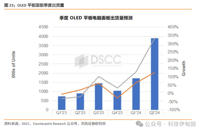 2024年第一季OLED平板面板出货量年增131%,达到新高的172万片,看好OLED平板计算机的成长趋势将维持稳定正向成长发展,预期在第二季度将会达到全年度的最高峰。显示器供应链顾问公司DSCC发布最新报告指出,今年第一季度全球平板计算机所搭载的OLED荧幕面板采购出货数量来到172万片,相比去年同期年增131%,刷新史上新高纪录。DSCC预计第二季度将再次环比增长127%,同比增长333%,达到另一个历史新高。看好OLED平板计算机的成长趋势将维持稳定正向成长发展,乐观预估在2028年全球平板计算机的渗透率,有望达16%市占份额,累计总销售收入额将来到55%。在第一季度期间,苹果采购OLED面板的出货数量就占高达47%,高居前三大品牌冠军,尤以13吋OLED面板为大宗、占35%,11吋OLED面板则占12.5%。OLED面板采购量的前三大品牌平板,除苹果iPad Pro(M4)之外,排名第二则是华为,占比25%;三星则位居第三,占比17%。DSCC预期今年第二季度将是全年平板计算机的OLED面板采购量最高峰,将达到390万片以上,季增127%。预估苹果采购OLED面板的数量也会比第一季要来的更多,推估很有可能从第一季的47%一举大幅攀升来到72%。此外,华为、微软和三星的平板计算机采购OLED面板数量皆会比第一季增长。