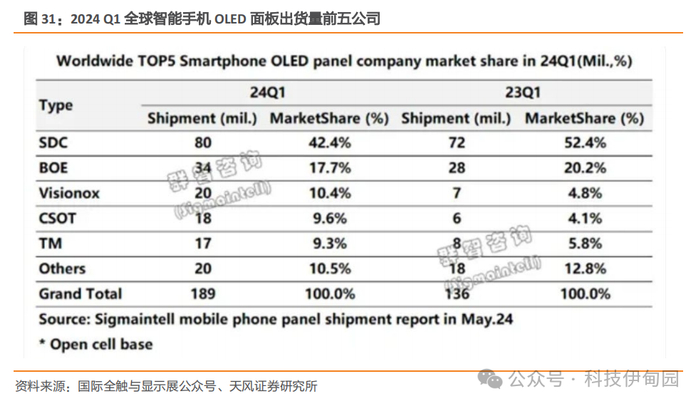 Q1全球OLED面板出货量排名:前5名中国独占4席。根据群智咨询的统计数据,全球智能手机面板市场在本季度出货量约为5.4亿片,同比增长约24.4%。在OLED面板领域,三星显示(SDC)以42.4%的市场份额保持全球OLED智能手机面板市场的领头羊地位。值得注意的是,三星显示在本季度的刚性OLED出货量超过了柔性OLED,显示出市场对刚性OLED需求的增长。京东方(BOE)以约17.7%的市场份额紧随其后,位列全球第二。京东方凭借其丰富的客户体系、领先的技术和产能优势,一季度OLED智能手机面板出货量达到约3400万片。此外,京东方还投建了国内首条G8.6代AMOLED生产线,预计将进一步推动OLED显示产业向中尺寸应用发展。此外,中国大陆OLED面板整体出货量在一季度约为9780万片,同比增长55.7%,市场占比首次超过半数,达到51.8%,较上个季度增加7.4%。