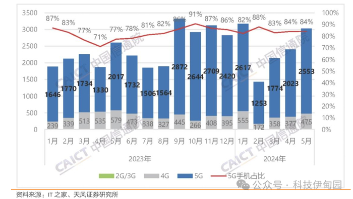 2024年5月国内市场手机出货量3032.9万部,同比增长16.5%,1-5月手机出货量1.22亿部,同比增长13.3%,看好产业链复苏。根据IT之家,中国信通院7月5日发布2024年5月国内手机市场运行分析报告,2024年5月,国内市场手机出货量3032.9万部,同比增长16.5%;其中,5G手机2553.1万部,同比增长26.6%,占同期手机出货量的84.2%。2024年1-5月,国内市场手机出货量1.22亿部,同比增长13.3%,其中,5G手机1.02亿部,同比增长20.3%,占同期手机出货量的83.9%。