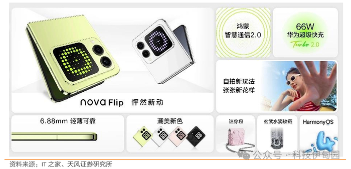 8 月 9 日,华为 nova Flip 小折叠屏手机正式开售,据官方介绍,是业界最薄小折叠手机。华为 nova Flip 是专为年轻群体设计的新潮小折叠,素皮版机身厚度为 6.88mm,重量为 195g。在交互上,华为 nova Flip 的“趣方屏”加入了诸多鸿蒙AI 趣玩功能,提供轻量级交互体验。具体来看,华为 nova Flip 首发了通话趣显 Call-emoji 创新互动方式,拨打电话时,手机外屏会变成一个充满趣味的动画舞台,各种 emoji 跃然其上。在核心规格上,华为 nova Flip 搭载 6.94 英寸 120Hz LTPO 内屏 + 2.14 英寸 60Hz OLED 外屏,全新升级鸿蒙智慧通信 2.0,搭载 4400mAh 硅负极电池、支持 66W 华为超级快充 Turbo 2.0,36 分钟即可满电。