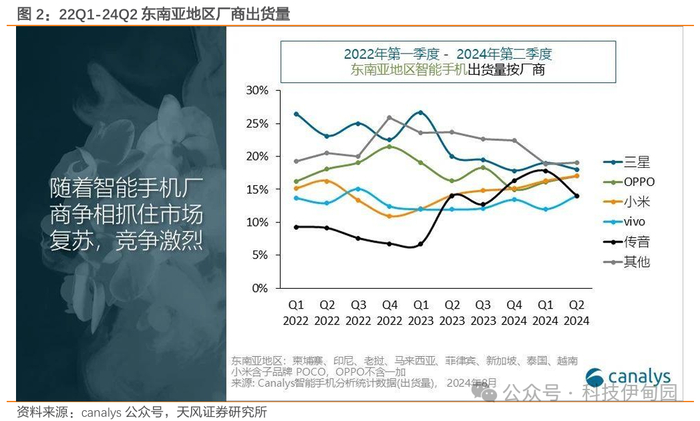 据Canalys报道,二季度,东南亚智能手机出货量2390万台,同比增长14%,高于全球增幅。2024年第二季度,东南亚地区智能手机出货量实现14%的同比增长,达到2390万台。三星在连续七次遭遇环比下滑后,迎来微增,出货量达到440万台,市场占比18%。OPPO(不含一加)重回市场第二,出货量达420万台,市场份额为17%。小米位列第三,其对入门产品的推进缩小了与前者的差距,出货量达400万台,市场份额17%。vivo重返第四名,出货量达340万台,市场份额为14%。传音在第一季度实现出货量的飙升后出现放缓,位列第五,出货量达330万台,市场份额为14%。