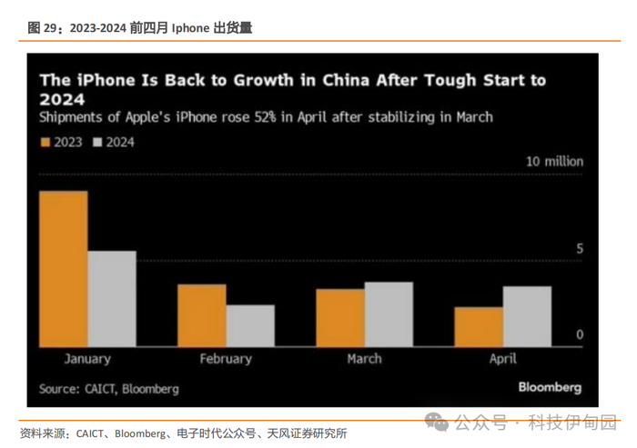 彭博社:4月份苹果iPhone中国出货量同比大涨52%。据彭博社报道,苹果公司的iPhone在中国市场强势复苏,上个月出货量同比飙升52%,这得益于零售合作伙伴提供的一系列折扣优惠。中国信通院的最新数据显示,2024年4月国内市场手机出货量2407.1万部,同比增长28.8%。据彭博社计算,其中约350万部来自国外品牌,绝大部分是iPhone。此前,苹果在中国市场经历了艰难的开局,今年头两个月销量大幅下滑,但3月份出现增长势头,4月份更是强势反弹。自2024年初以来,苹果及其中国经销商一直在下调价格,这些优惠举措将持续到即将到来的618电商购物节。彭博社的分析师认为,随着消费者在最近的一项调查中表现出更高的换新设备的兴趣,iPhone在中国市场的下滑趋势可能即将结束。