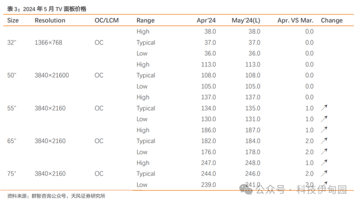 TV面板价格:五月,全球LCD TV面板产业上下游对市场预期出现明显分化,终端零售未见恢复使得渠道及整机厂商预期趋于保守,而面板厂则规划减产应对需求波动。全球LCD TV面板市场供需环境在双向调整中呈现“整体平衡,结构波动”的状态。根据群智咨询调研,TV面板方面,32",需求持续降温伴随供应收缩,5月价格持平。50",面板厂策略趋向温和,5月开始均价止涨回稳。55",备货需求有所回落,5月均价涨幅收窄至1美金。大尺寸方面,供应集中度较高,5月均价上涨2美金。