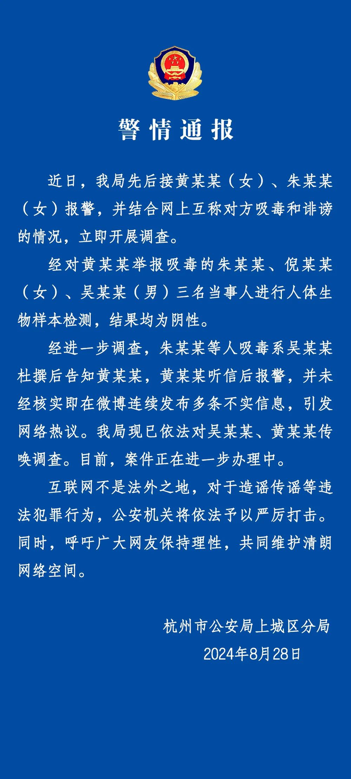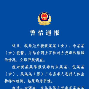 近日,我局先后接黄某某(女)、朱某某(女)报警,并结合网上互称对方吸毒和诽谤的情况,立即开展调查。