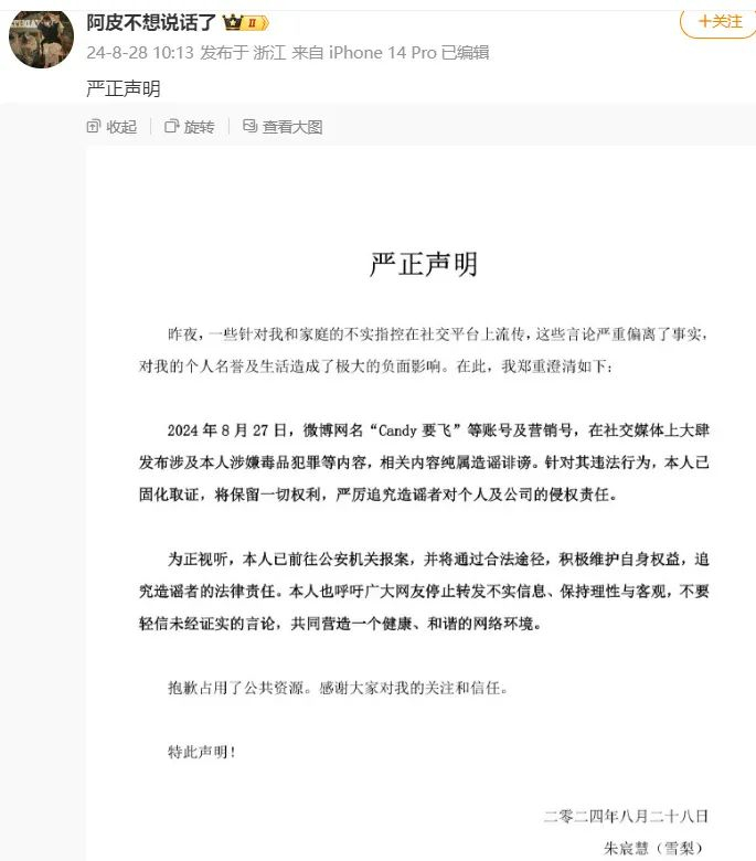 同日,“雪梨”否认吸毒称:“Candy要飞”等账号及营销号,在社交媒体上发布涉及本人涉嫌毒品犯罪等内容,纯属造谣诽谤,针对其违法行为,已固化取证,并已前往公安机关报案。
