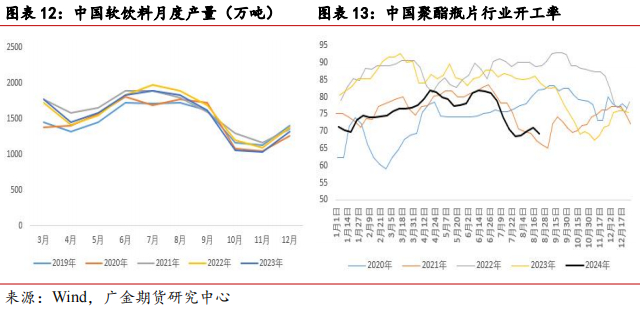 软饮料行业具有明显的淡旺季特征,高温天气助推软饮料产品消费,因此软饮料产量通常在6-9月达到全年高峰,9月份后随着气温降低,软饮料行业进入消费淡季,产量也随之下降。因此,瓶片企业多倾向于在5-8月份提高装置负荷,以应对下游行业的旺季,8-9月份后装置负荷将逐步下降。