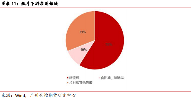 瓶片下游应用领域有软饮料、食用油、调味品、片材包装等,其中软饮料行业占比最大。