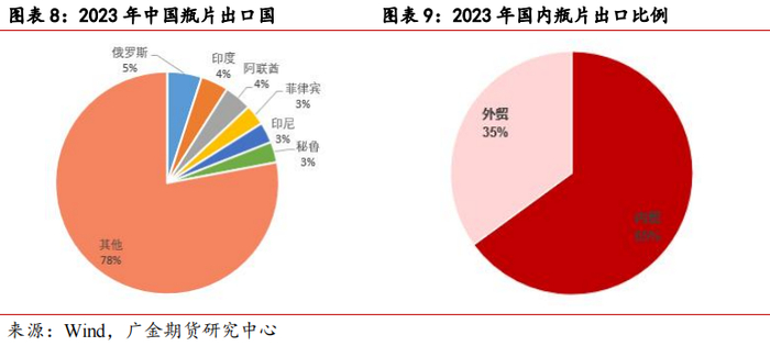我国瓶片境外销售占比较高,2023年瓶片出口量占全年产量3.5成。因此在研究瓶片需求时,出口情况不可忽略。2021年-2022年,海外市场受疫情后需求恢复以及欧洲瓶片装置开工率大幅下行影响,对中国瓶片的需求较强,促使当期中国瓶片出口量较高。