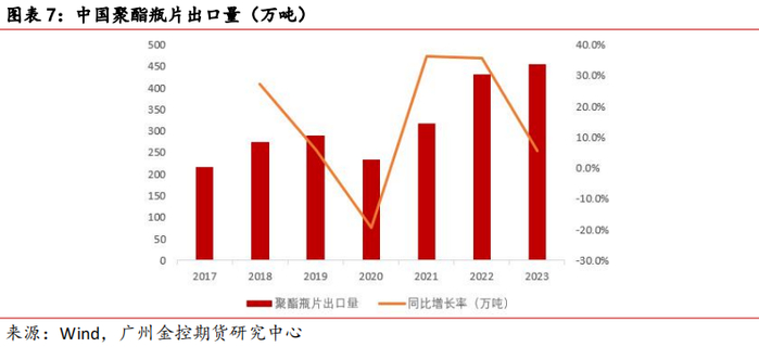 国内瓶片产能逐年递增,企业需要开拓海外市场以消耗过剩产能,不仅如此,国内聚酯产业链配套完善,瓶片价格对比海外产品具备较强的优势,出口需求旺盛。