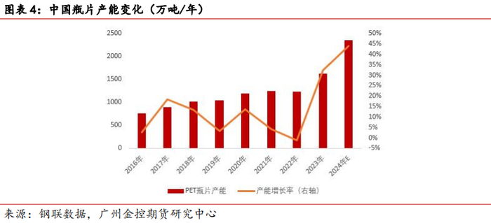 2019-2022年间,瓶片产能增速有限,行业整体利润水平较为可观。进入2023年,瓶片行业开始进入快速扩张期,主要原因是前期瓶片利润较好叠加上游聚酯原料供应充足,企业纷纷扩大自身规模,2023年瓶片产能增速为30%。目前仍有较多瓶片装置计划投产,预计2024年瓶片产能增长率将维持较高水平。产能规模高速增长,而下游需求增速有限,导致瓶片加工差开始逐步压缩。