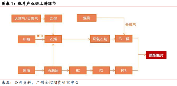 瓶片是以PTA和乙二醇作为原料聚合得到的聚酯颗粒,这两种上游原料对瓶片价格产生最直接的影响。按照原料比例来看,生产1吨聚酯瓶片需要PTA 0.855吨和乙二醇0.335吨。PTA方面,上游为原油、石脑油、PX等原料,其中原油和PX对PTA价格的影响较大;乙二醇方面,上游为煤炭、乙烯、乙烷等原料,其中煤炭、乙烯对乙二醇价格的影响较大。