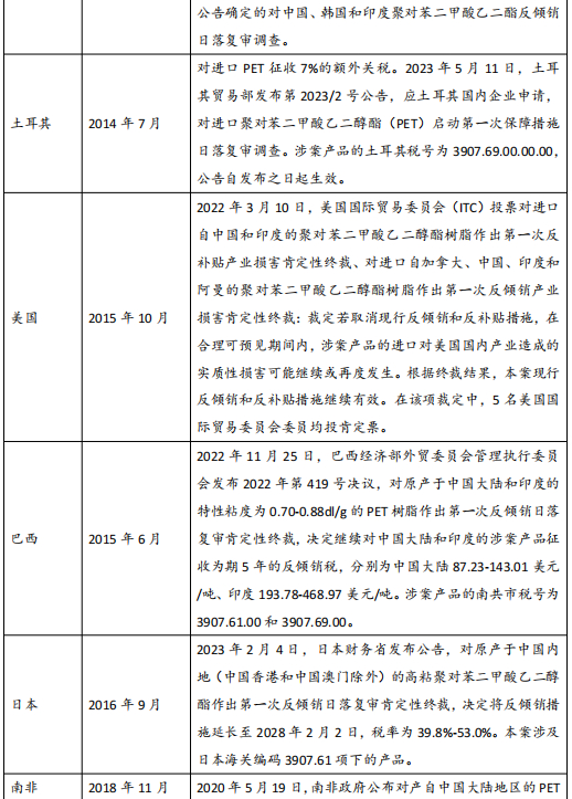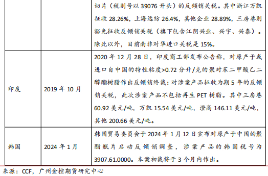 海外针对中国聚酯产品发起多项反倾销调查,部分国家加征高额关税限制中国大陆地区生产的聚酯产品出口。目前中国瓶片出口受到反倾销调查的影响相对有限,但随着全球需求增长变缓,反倾销措施对中国瓶片需求的影响将加大。因此,在关注瓶片出口情况时应着重跟着海外各国家和地区对中国瓶片的政策壁垒。