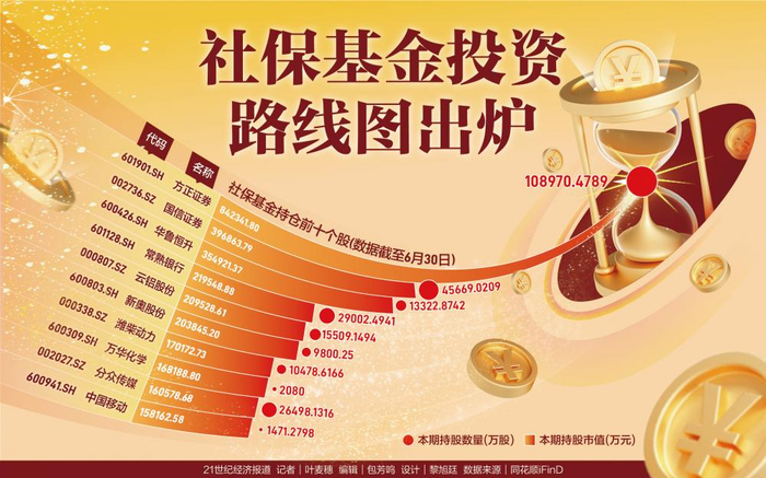 据同花顺统计,截至8月28日,有451家上市公司的前十大流通股股东中出现了社保基金的身影。二季度,社保基金对89只个股持股新进前十大流通股股东序列,对144只个股持股数量增加。行业方面,截至上半年末,社保基金对基础化工、医药生物和非银金融的持仓市值居前,持有市值分别达到167.4亿元、125.8亿元和124.1亿元。其中,基础化工第一大重仓股为华鲁恒升,持仓市值35.5亿元;医药生物第一大重仓股为兴齐眼药,持仓市值13.2亿元;非银金融第一大重仓股为方正证券,持仓市值84.2亿元。