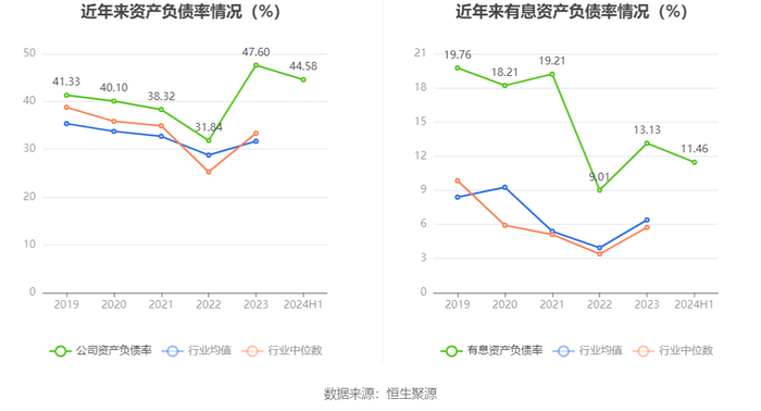 在偿债能力方面,公司2024年上半年末资产负债率为44.58%,相比上年末下降3.02个百分点;有息资产负债率为11.46%,相比上年末下降1.67个百分点。