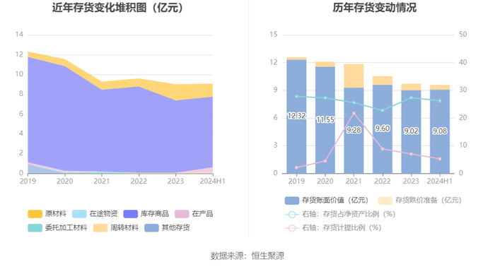 从存货变动来看,截至2024年上半年末,公司存货账面价值为9.08亿元,占净资产的26.24%,较上年末增加600.5万元。其中,存货跌价准备为5051.15万元,计提比例为5.27%。