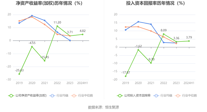 数据显示,2024年上半年公司加权平均净资产收益率为4.82%,较上年同期增长2.50个百分点;公司2024年上半年投入资本回报率为3.79%,较上年同期增长1.81个百分点。