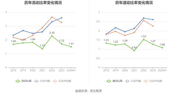 2024年上半年,公司流动比率为1.51,速动比率为1.08。