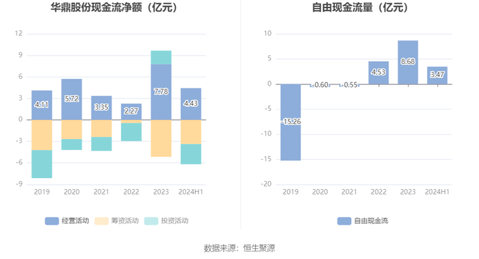 2024年上半年,公司经营活动现金流净额为4.43亿元,同比增长11.12%;筹资活动现金流净额-3.37亿元,同比减少266.21万元;投资活动现金流净额-2.82亿元,上年同期为2.21亿元。