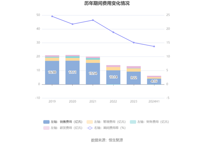 2024年上半年,公司期间费用为6.09亿元,较上年同期减少2074.47万元;期间费用率为13.71%,较上年同期下降1.89个百分点。其中,销售费用同比下降6.34%,管理费用同比下降1.72%,研发费用同比增长14.49%,财务费用由去年同期的-545.93万元变为-993.14万元。