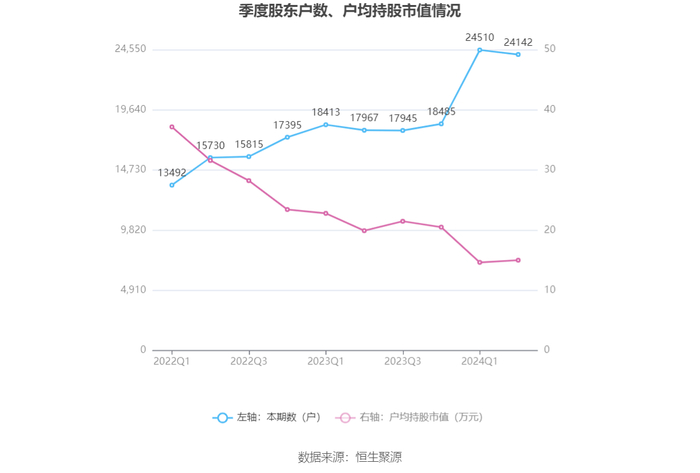 筹码集中度方面,截至2024年上半年末,公司股东总户数为2.41万户,较一季度末下降了368户,降幅1.50%;户均持股市值由一季度末的14.64万元上升至15.00万元,增幅为2.46%。
