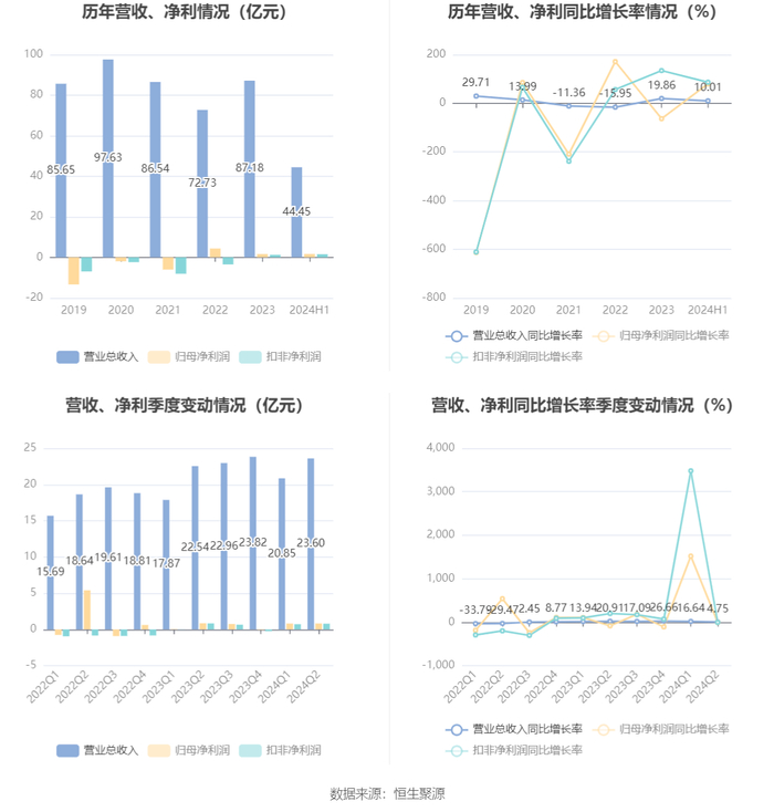 根据半年报,公司第二季度实现营业总收入23.6亿元,同比增长4.75%,环比增长13.23%;归母净利润8222.26万元,同比下降3.78%,环比增长2.04%;扣非净利润7945.64万元,同比下降4.74%,环比增长10.08%。